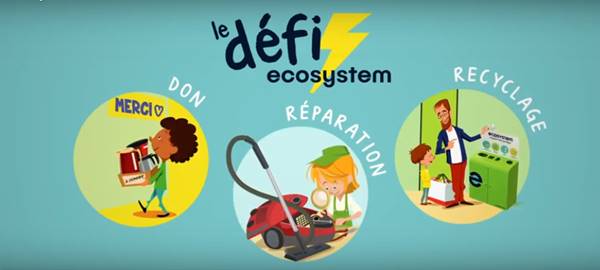 Le défi Ecosystem est un défi pédagogique de sensibilisation au développement durable, à travers l’exemple de la seconde vie des ampoules et des équipements électriques et électroniques. Ce défi est ouvert à toutes les classes de cycles 2 et 3. Les enseignants qui le souhaitent peuvent recevoir un kit pédagogique gratuit qui contient différents supports permettant de mener en classe des défis ludiques et informatifs avec les élèves. Il suffit de s’inscrire en ligne pour le recevoir : défi Ecosystem.