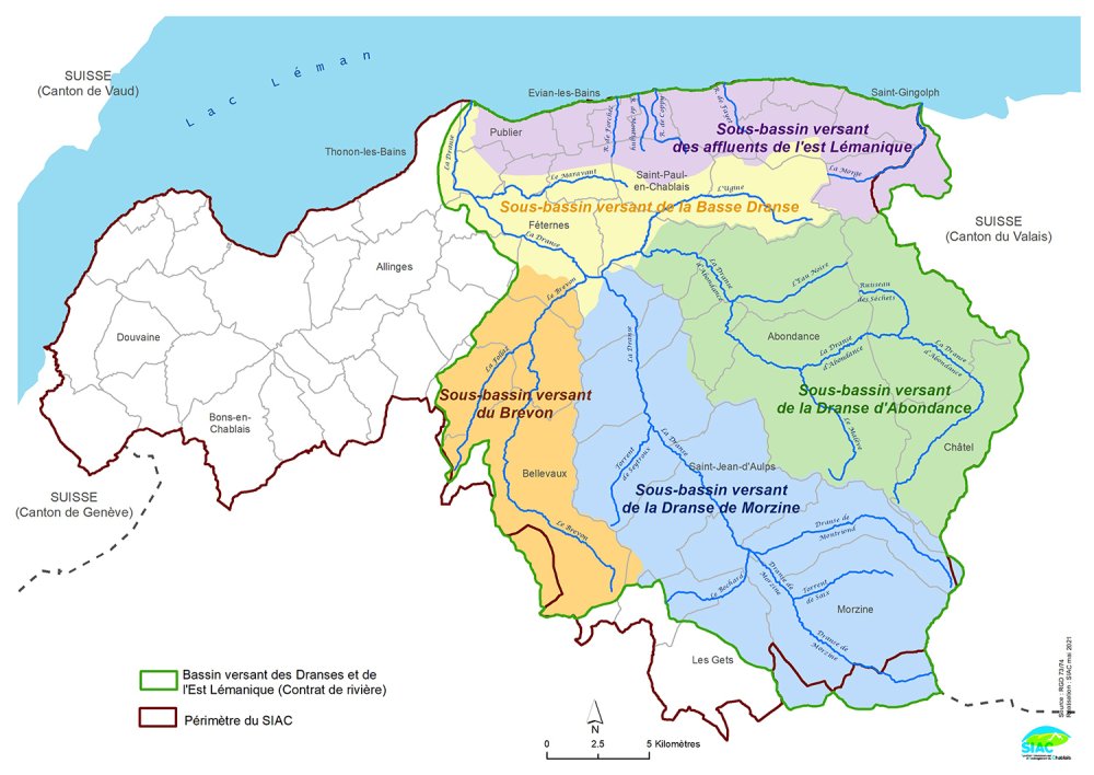 Le territoire d’interventions qui couvre une superficie de 638 km2 comprend 5 sous-bassins versants : le Brevon, la Dranse de Morzine, la Dranse d’Abondance, la basse Dranse et les affluents de l’est lémanique, avec un linéaire cumulé de cours d’eau de 210 km. Il concerne 41 communes et 88 000 habitants.